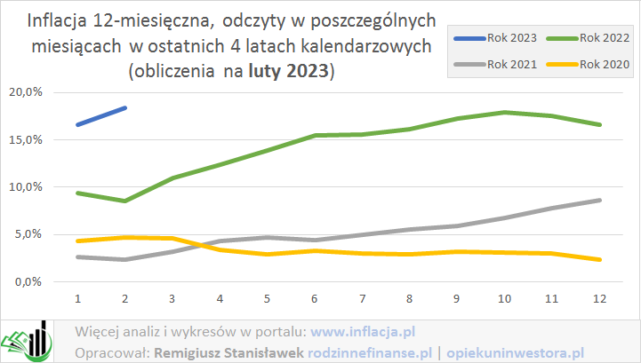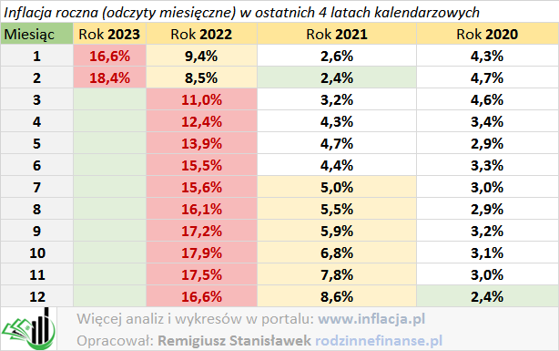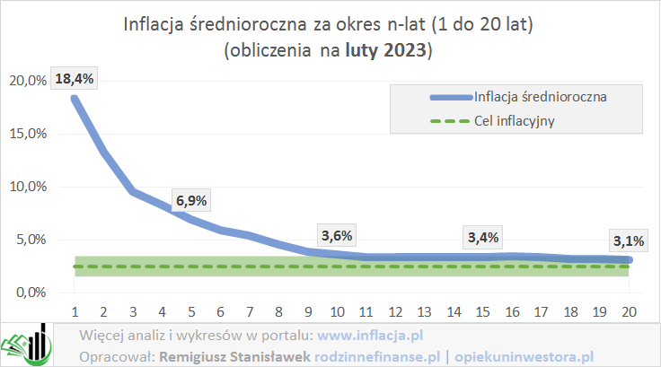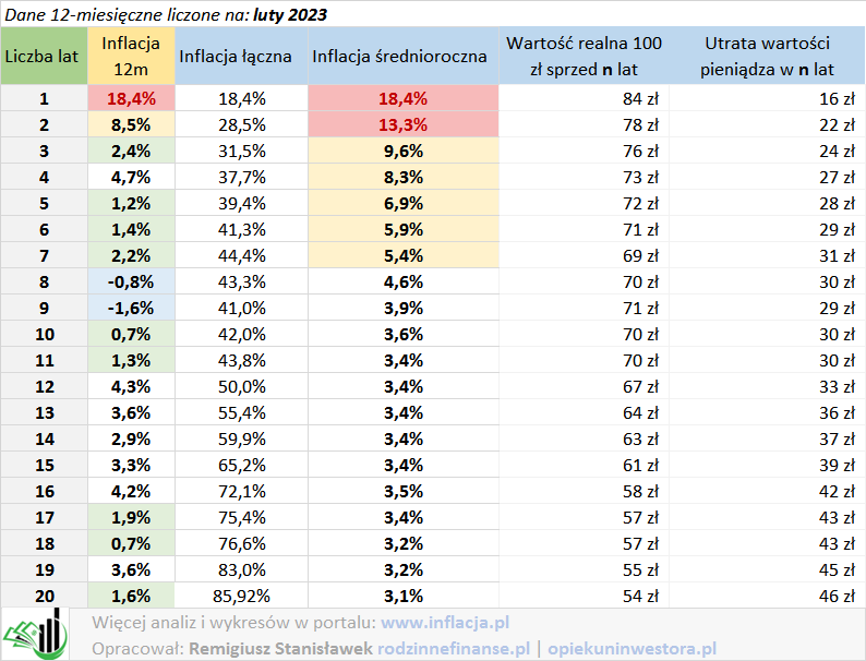 Poniżej aktualne dane (obliczenia na luty 2023) pokazujące wyniki oparte o odczyty rocznej inflacji w ostatnich 20 latach.