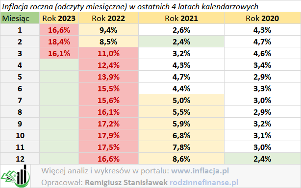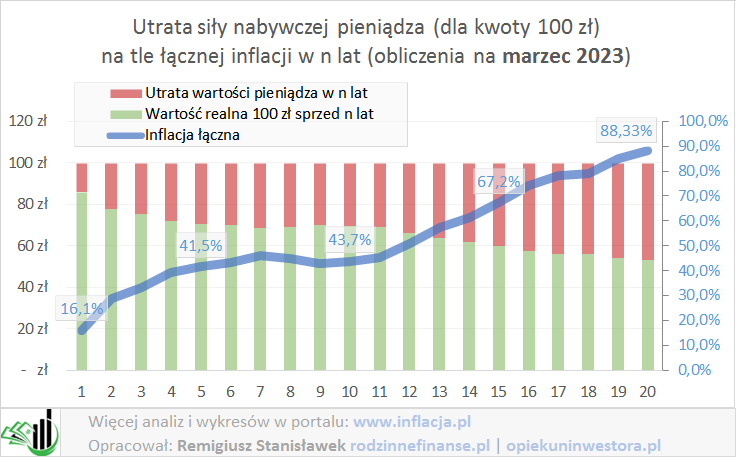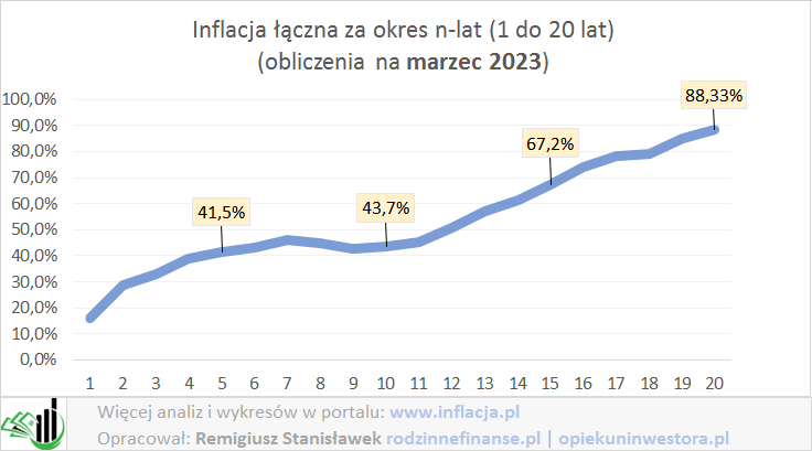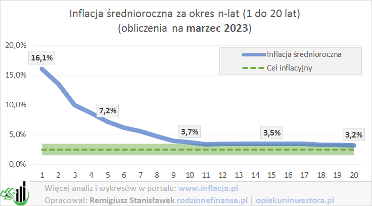 Poniżej aktualne dane (obliczenia na marzec 2023) pokazujące wyniki oparte o odczyty rocznej inflacji w ostatnich 20 latach.