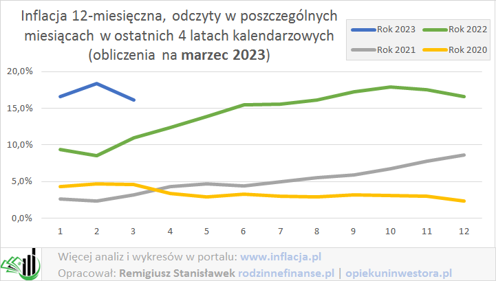 Wykres z porównaniem do poprzednich lat. Wyraźnie widoczne wzrosty inflacji w latach 2021 i 2022 w porównaniu do stabilizacji w trakcie roku 2020.